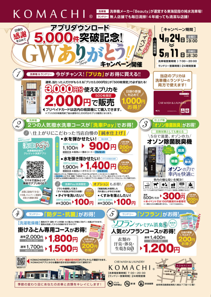 岐阜県にある洗車場&ランドリーの直営店「KOMACHI」は、おかげさまでアプリ会員が「5,000人」を突破いたしました!日頃のご愛顧に感謝を込めてキャンペーンを開催します。